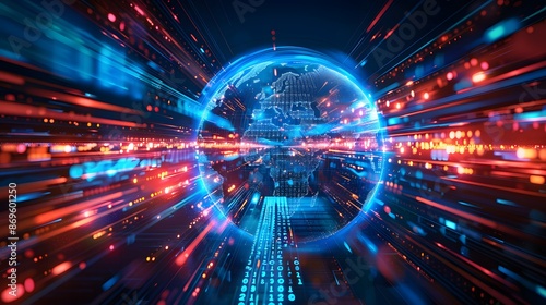 High-speed data transfer concept with a digital world globe centered on America, showcasing international connectivity