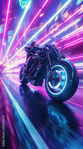 High-speed motorcycle bursting through a neon-lit futuristic city street with glowing energy and vibrant colors