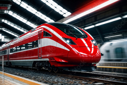 High-speed red and white train is moving down the tracks. The train is surrounded by a bright light, which gives the impression of speed and motion. The train is the main focus of the image
