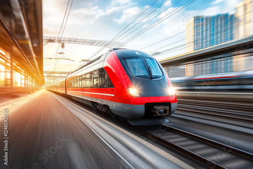 High-Speed Red Train in Motion on Airport Station Platform with Blurred Background and Dynamic Sunlight Lighting Effects Showcasing Modern Design. Generative Ai