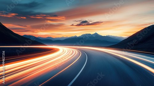 High-speed road with motion blur, beautiful sunset, and mountains in the background