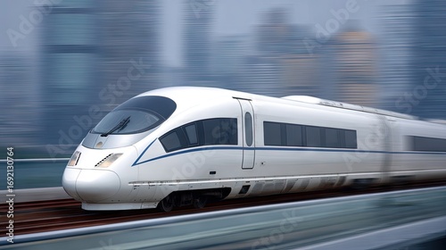 High-speed train in motion along modern railway tracks near urban skyline with blurred background during daylight