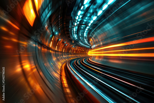 High-speed train speeding through a vibrant, illuminated tunnel, showcasing motion blur and dynamic lighting.