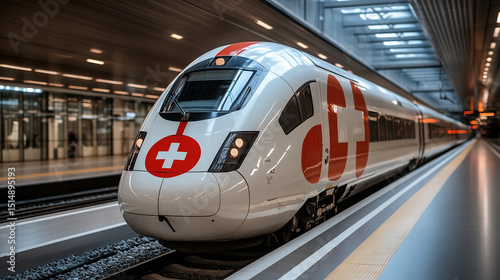 High-speed train transporting medical supplies 3D rendered cartoon plastic style on white background