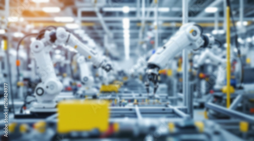 high-tech assembly line with robotic arms and automated systems, full blurry view, no element in focus, clean environment, bright lighting