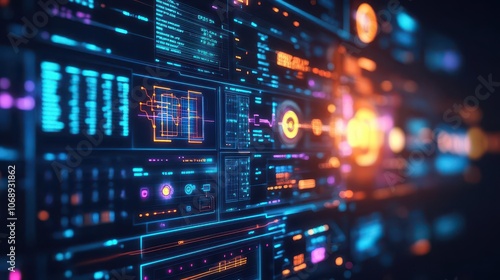 Hightech control panel showing energy levels, engineer monitoring data in realtime, dark background, glowing lights, sharp focus