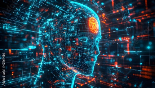 High-tech digital control panel featuring glowing blue and orange holographic interface elements, circuits, and futuristic design details in a sleek dark background