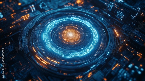 High-tech digital interface featuring glowing blue and orange circular patterns.