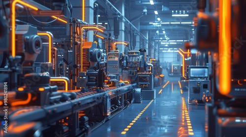 High-tech factory with AI-controlled robots, IoT-enabled machinery, precision engineering, smart sensors tracking performance, futuristic design