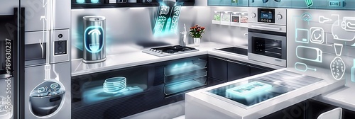 Hightech kitchen voicecontrolled appliances touchactivated countertops and a futuristic wallmounted recipe system