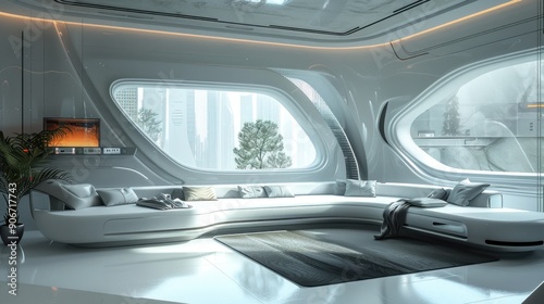 High-tech living room with floating sofa, touch-sensitive wall, robotic assistant.