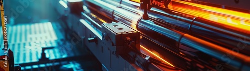Hightech machinery cutting carbon steel rectangular pipes, side view, highlighting manufacturing techniques, cybernetic tone, complementary color scheme