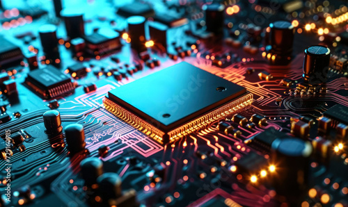 High-tech microprocessor chip on a motherboard, a concept of advanced technology, computing power and circuitry in modern electronics design