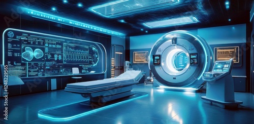 High-Tech MRI Room with Futuristic Medical Equipment and Neon Lighting for Advanced Healthcare in Hospital Environments