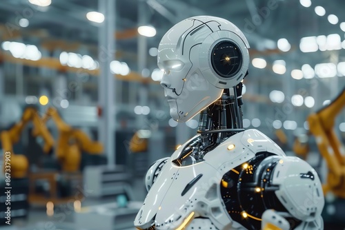High-tech robotic humanoid in an advanced factory setting with machinery in the background showcasing modern industry automation.