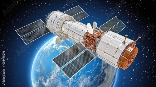 High-tech satellite orbiting the earth, with a backdrop of stars and the blue planet below, symbolizing communication -