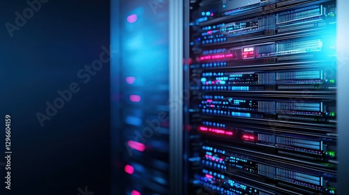 High-Tech Server Rack With Blue and Red LED Lights in a Modern Data Center