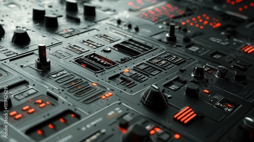 High-tech silver metallic surface with futuristic controls and shiny minimalist decorations.