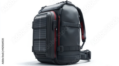 High-tech travel backpack with solar charging panel, USB port, and multiple internal compartments, isolate on white background