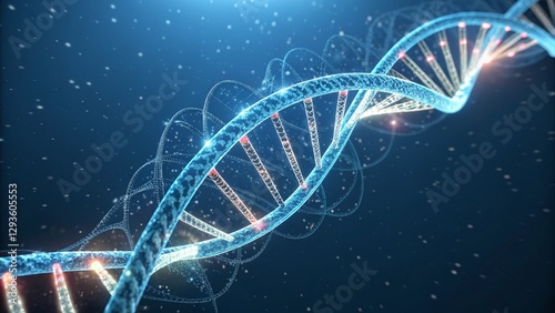 High-tech visualization of DNA structure with glowing connections and molecular details on a dark blue gradient, suitable for presentations on genetics, genomics, and medical technology