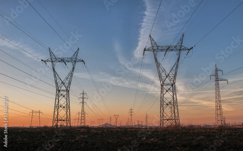 High-voltage power lines at sunset, high voltage electric transmission tower. Industrial concept.