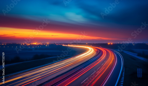 Highway at night with long exposure lights and streaks of light from cars driving fast.