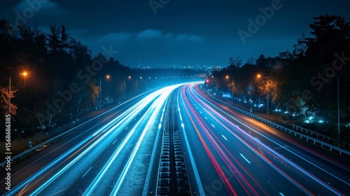 Highway nightscape with blurred light trails of fast-moving cars under a dark blue sky