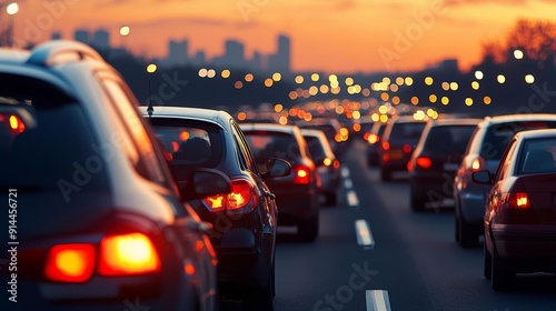 Highway traffic jam at dusk, vibrant sunset colors, illuminated car lights, cityscape background, crowded road, dramatic sky