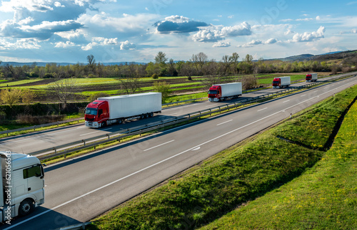 Highway transportation scene with Convoy of red and white transportation trucks in line on a rural highway under a beautiful blue sky