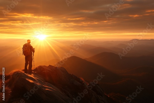 Hiker enjoys a breathtaking sunrise view from a mountain peak surrounded by rolling hills and distant mountains