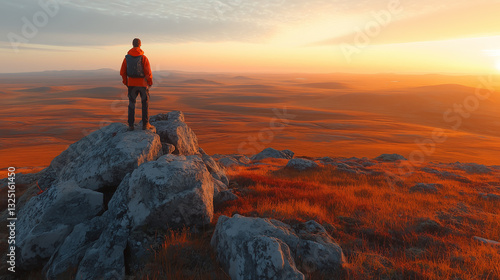 Hiker enjoys breathtaking sunset view from rocky vantage point on highland terrain in the evening