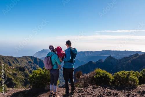 Hiker family with small child looking at scenic view of misty hills and canyon of rugged terrain on Madeira island, Portugal, Europe. Idyllic hiking trail to mountain peak Pico Ruivo. Aerial vista