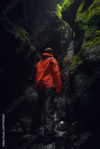 Hiker in a red jacket exploring Rauðfeldsgjá Gorge, a mossy canyon on Snaefellsnes Peninsula, Iceland.