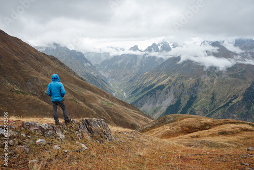Hiker in the mountains enjoying the view, Zemo svaneti Georgia