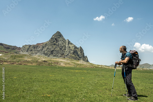 Hiker man spotting a peak from a meadow
