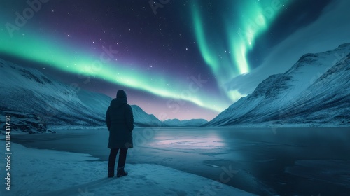 Hiker observing wonderful northern lights reflecting on frozen lake at night