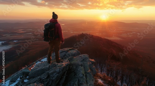 Hiker on Mountain Peak at Sunset Overlooking Vast Landscape