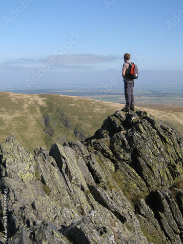 Hiker on precarious Sharp Edge on way to Blencathra, Lake District