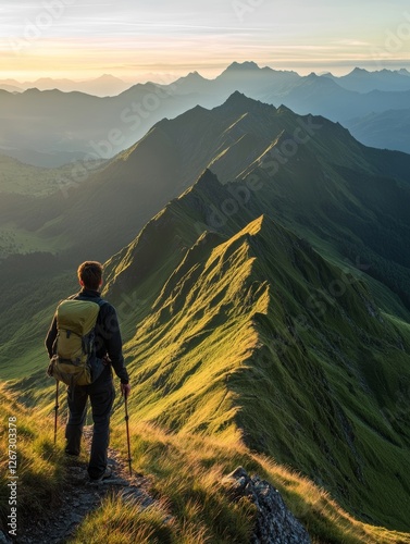 Hiker overlooking a majestic mountain range at sunrise - ai