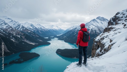 Hiker Overlooking Beautiful Snowy Mountain scenery and Turquoise Lake.