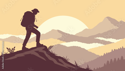Hiker Silhouette on Mountain Peak at Sunset with Scenic Landscape View - Adventure and Exploration Journey