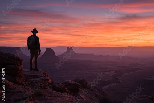 Hiker standing on a cliff, watching the sunset over a vast desert landscape.