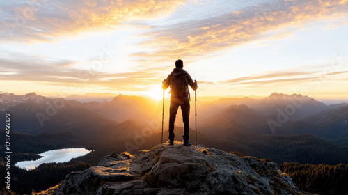 hiker standing on mountain peak, admiring breathtaking sunset view