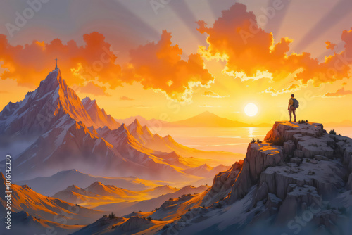 Hiker standing on mountain peak admiring dramatic sunset over ocean and mountains