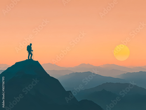 Hiker stands on mountain peak, silhouetted against a stunning sunset, surrounded by layered mountains, capturing the essence of exploration and natural beauty