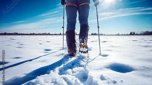 Hiker Treks Across Snowy Field with Trekking Poles Under Sunny Sky on Winter Adventure