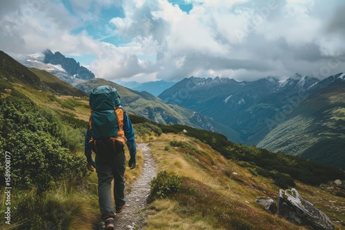 Hiker walking on mountain path enjoying breathtaking valley view, embracing adventure and wanderlust