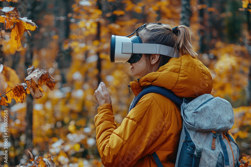 Hiker wearing a virtual reality headset is exploring the wilderness, immersing herself in a digital world while surrounded by nature