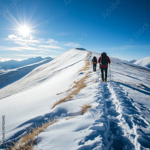 Hikers Ascending a Snowy Mountain Ridge Under a Clear Sky
