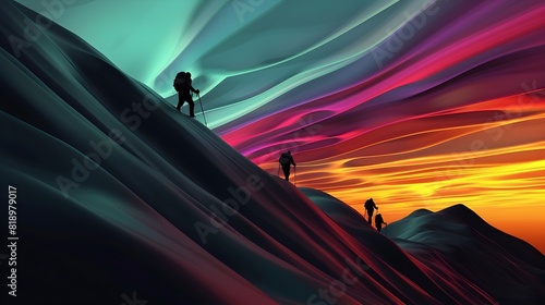 Hikers Ascending Vibrant Mountain Landscape at Dawn